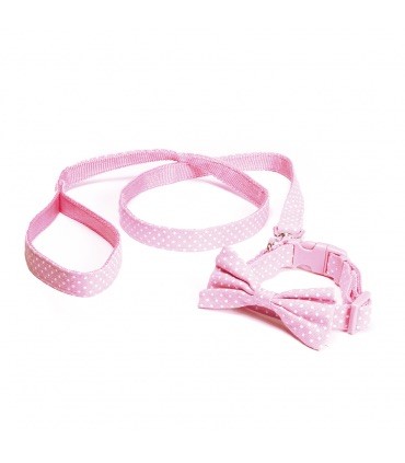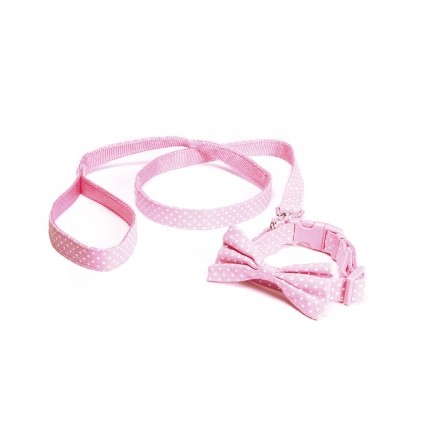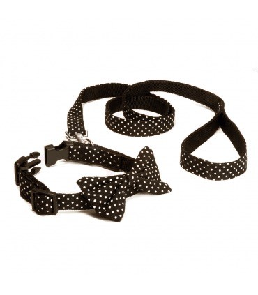 Ensemble collier /Laisse en nylon réglable à pois noir avec nœud papillon intégrer